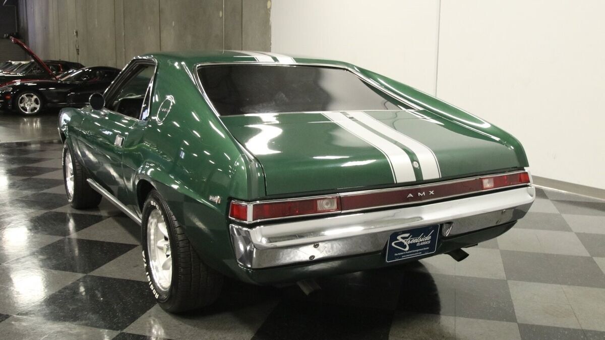 Vehicle Original VIN : A9M397T229617*Factory-correct Hunter Green *Silver racing stripes look sophisticated and sporty *Beautiful design on the rarely-seen short wheelbase AMX *Form-hugging chrome bumpers *Trans Am Superlite wheels *Wide BF Goodrich T/As *Attractive classic black interior *Upgraded leather bucket seats with heat *Deeply tinted windows *AM/FM stereo with Bluetooth *R134a air conditioning *Classic sports steering wheel *Large speed and tach *Hurst floor shifter *343 cubic-inch V8 -Edelbrock four-barrel carburetor --Edelbrock Performer aluminum intake -MSD distributor --Shorty headers --X-pipe dual exhaust with Thrush mufflers *Four-speed manual transmission *Power steering and power brakes *Owner's manual *Reproduction window sticker for AMX