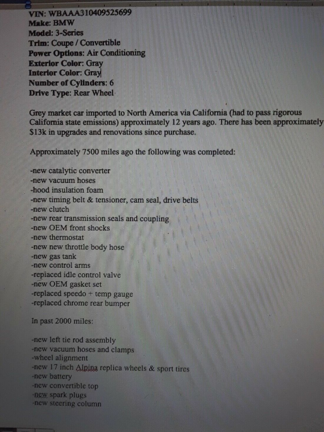 BMW 3-Series . Condition is Used.Hi, I am selling my rare 1985 BAUR BMW 323i Convertible. This has been truly a fun car to drive. It has had many upgrades and a partial engine rebuild. I have listed some of the items done. I have also included a little history of the BAUR E30. The car runs and drives well. However, it will need some new tires. Tread is good but they have vibration at high speeds. Clear coat starting to fade on trunk and hood. One rust spot inside the trunk at the trunk lip. Shock towers, floors, and trunk okay. Also have some Alpina wheels that go with the sale.
