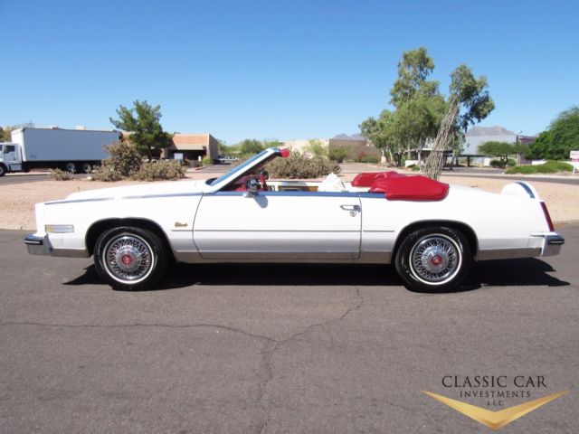 Overview: Here is an absolutely stunning 1985 Cadillac Eldorado Biarittz convertible in excellent condition inside and out. This is a completely all original car with only 30K pampered original miles on it. It has been part of a large Cadillac collector for many years. Out of the 50 plus Cadillac?s he owned, this is one of his favorites that he kept at home, in his home garage. The car is truly pristine, ordered in the super desirable triple white color combination with red dash and carpets. It is a real stunner with the optional continental kit and factory gold package. It does not get any classier then this. This was the last year for the Eldorado convertible to ever be built, even until this day. Which makes this a instant collector item. They only built 2,300 in 1985 and there are not very many left with these low miles and in this mint of condition. This was car to have in 1985 as it was priced at over $11K more then a coupe. We just had the car completely serviced and it is ready to drive and enjoy. Don't miss out on this one. Options/Equipment: