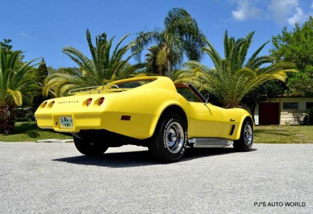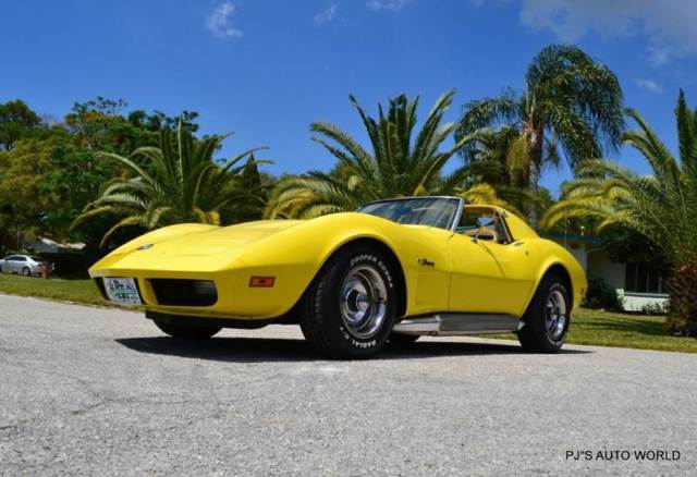 1974 Chevrolet Corvette For Sale. Number Matching 350 cubic inch V8 engine block, 4 speed manual transmission, engine dress up package, power steering, 4 wheel power disc brakes, 15†rally wheels with a new set of Cooper Cobra white letter radial tires, side pipe dual exhaust, factory bright yellow car, rear luggage rack, color keyed T-Tops, dual chrome sport mirrors, vacuum operated pop up headlights, saddle bucket seat interior, power windows, tilt and telescoping steering column, AM/FM/CD radio. Beautiful and ready to enjoy! This is one great looking C3 Corvette!Similar vehicles