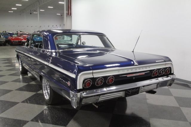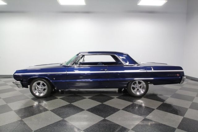 A 1964 Chevrolet Impala hardtop is an iconic classic. But just because you want vintage looks, doesn't mean you miss out on modern amenities like an A/C interior, slick metallic paint, five-speed stick shift, powerful V8, and much more. This coupe is custom, classic, and premium all in the first glance. After all, this starts out with all the best bright work. That means big chrome bumpers, a wide grille, and plenty of trim outlining the... hardtop profile. The upgraded trim with the machine-turned rear panel and matching full-length side pieces has the aggressive look to live up to the Super Sport name. But while these are the classic elements you love, it's all set against a modern Indigo Blue that has a regal luster the moment the sunlight hits it. Plus, there are nice details like upgraded headlights, bow tie exhaust tips, and LEDs in the Impala's hallmark six taillight arrangement. It's all finished off with the iconic Cragar SS wheels. This creates a very distinctive total package that comes from making all the right investments. Inside, the sea of blue continues with the custom tweed interior. This is a full-sized coupe that's comfortable for family and friends. So they can stay happy with features like cold R134a air conditioning and a modern AM/FM/CD/XM stereo with amplified Kenwood speakers. But the best upgrades are what make this a true driver's machine. For example, you get a leather-wrapped Billet Specialties mounted on an Ididit tilt column. Plus, there's a large AutoMeter tach mounted ahead of the factory speedometer. This pairs nicely with the bright Hurst shifter that's calling out for your right hand. The moment you open the hood, you can instantly tell there have been a ton of money spent here. This is a 350 cubic-inch ZZ4 performance crate motor, and there's only about 9k miles on this V8. It's quite well presented with thoughtful touches like the blue air cleaner element and bright valve covers. Plus, it has the right supporting components like the aluminum radiator and billet pulleys on serpentine belts. But what you'll really love about this V8 are the performance enhancements. It has a big Holley 770 CFM double-pumper four-barrel carburetor, GM performance intake, aluminum heads, MSD ignition, and Hedman headers that feed the rumbling Flowmaster dual exhaust. Best of all, you have complete control over this enhanced motor and its thunderous soundtrack thanks to the Tremec TKO600 five-speed manual transmission. This feeds a beefed up rear end that features versatile 3.73 gears and Positraction. Plus, you get the right driving features like an upgraded CPP power steering system and front disc brakes. So this is a powerful package that's built to feel confident on the road. You know this is a special machine - and we even have the awards and magazine features to prove it! The sale even comes with the owner's manual. It's a total package classic that's ready to show off everywhere and easy enough to drive on the morning commute. So if you're looking for one coupe to do it all, don't let this one slip away. Call now!