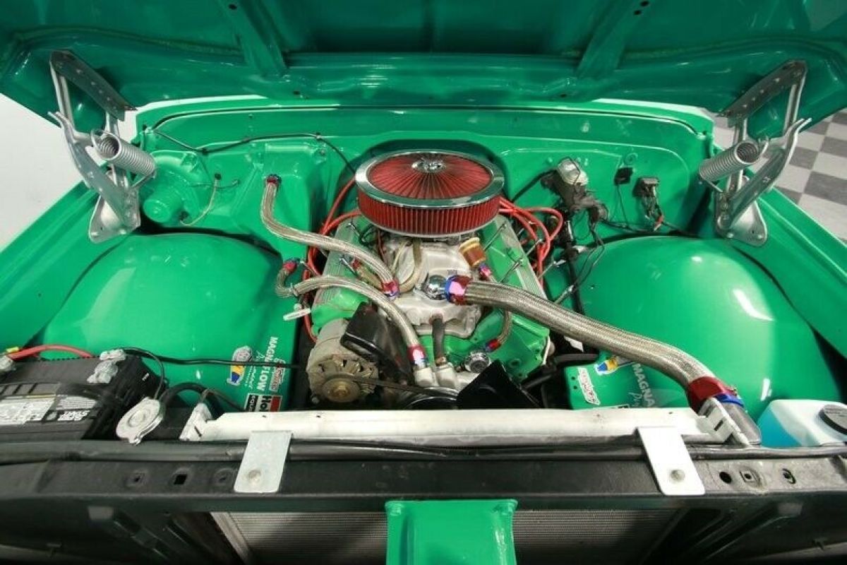 The engine bay has the smooth look of a thoughtful presentation. So not only do the inner walls match the exterior turquoise, but also more complicated pieces, including the block and ribbed valve covers. At the center of this stylish prevention is a powerful heart with a 454 cubic-inch V8. This big block has been enhanced with a Holley four-barrel carburetor, Edelbrock RPM air gap intake, and full headers feeding the rumbling dual exhaust. So yes, this is one powerful pickup! There are even nice supporting pieces, like steel braided hoses, AN fittings, and an aluminum radiator. There are solid stock-style pieces for a great driver, like power steering, a TH350 three-speed automatic transmission, and a 12-bolt rear end. Plus, you have nice upgrades like newer investments in the trailing arm rear suspension and the grip of modern performance tires.