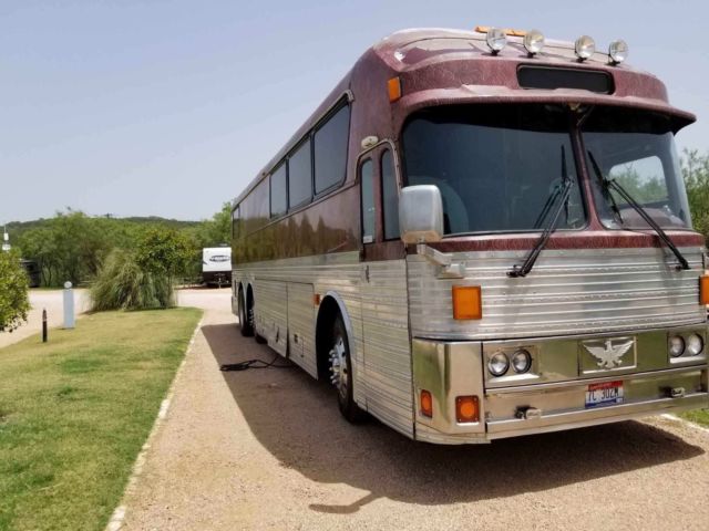 Attn: THIS BUS IS NOT RUNNING AND NEEDS EITHER A MOTOR REBUILD OR SWAP.Silver Eagle Tour Bus once owned by Texas Honkytonk legend Dale Watson and later by Micky and the Motorcars. The entire interior was redone with tooled leather by Dale Watson. This bus has 9 private bunks with tooled leather curtains. Rear of bus is a lounge with a sofa/bed and table with one seat and a sink. Front has two sofas, a kitchenette, a dinette, built in cooler and a bathroom. Bus has a 15,000 watt Kubota Power Tech generator that has just been serviced and starts and runs excellent. Generator powers the bus’ 4 roof air conditioners which keep the bus nice and chilly. Transmission was functioning fine when motor went.