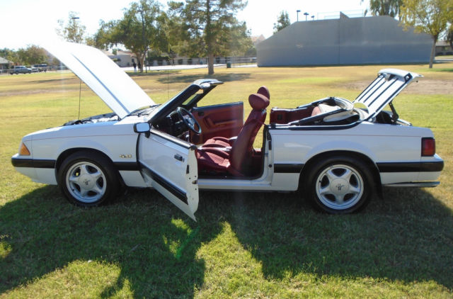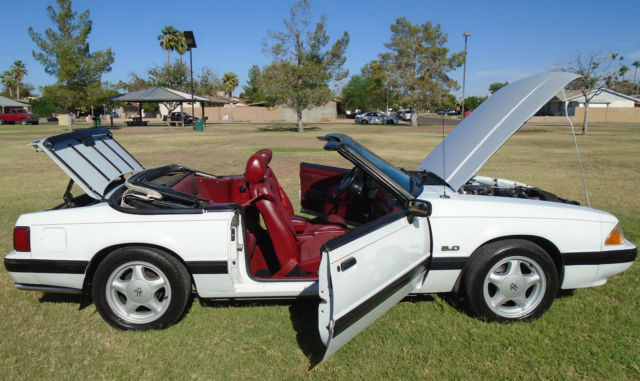 1989 Mustang LX 5.0 Liter V8, Automatic Transmission, Power Steering, Power Disc Brakes, Factory Air Condition, Power Convertible Top, Dual Lumbar Seats, Dual Power Outside Mirrors, Luggage Rack, Finished In White Exterior, Red Cloth Interior, Working factory White Convertible Top, Aluminum Pony Wheels with new radial Tires, Spare Jack Assembly,