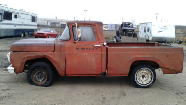 1960 Ford F100 Short Bed Truck. Complete less hood emblems. Selling with No Reserve to the highest bidder. Can help to arrange to ship anywhere for buyer.This Ford F100 Short Bed is in all original un-restored condition. It requires some restoration. There is some rust but overall it is exceptionally solid for an un-restored example. The tailgate is in pretty nice shape. The paint looks to be original. The interior is all original. It rolls freely and steers so will load easily onto a trailer. The front tires will hold air but for no more than 5 minutes.