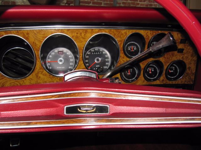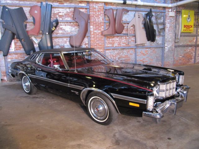 Gorgeous 1974 Ford Gran Torino Elite with 23,360 original miles. Fantastic color combination black with optional red knit cloth interior. Indoor stored since new. No rust ever. Spare wheel and tire never mounted on car. This lovely car has been well cared for by its three owners. Paint refreshed by the second owner years ago. Drives as good as it looks. Very reasonable buy-it-now.Some pertinent Elite text from the 1974 Ford Torino sales brochure: “Individually adjustable split bench seat, impeccably tailored in Dark Red (LD) Knit Cloth with the luxurious feel of Cashmere. Plush 25-oz cut-pile carpeting, complete instrumentation (tachometer, trip odometer, oil, amp, temperature and fuel gauges, and electric clock), burled walnut wood-tone panel accents, visor vanity mirror, luggage compartment trim and an automatic seat back release. Westminster cloth seat trim, color-keyed cut-pile carpeting, deluxe steering wheel, color-keyed seat belts, hood ornament, color-keyed protective body-side moldings, full vinyl roof, unique twin opera windows, unique wheel covers.”