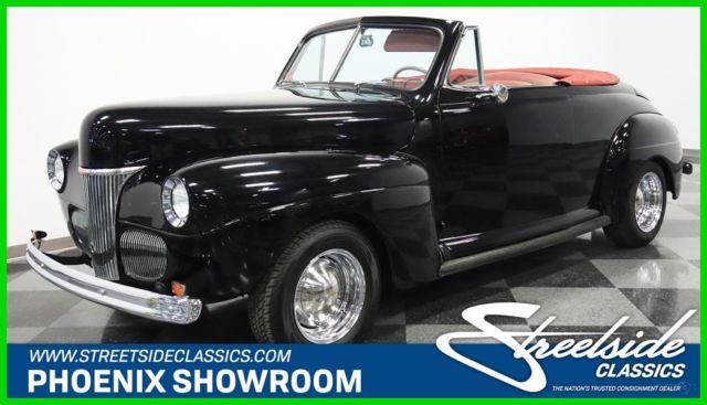 Here's a cool hot rod that mixes rarity and originality with some great upgrades. This 1941 Ford Super Deluxe convertible is a true head-turner at any car show, and with great driveability, you will want to cruise all day long. This well-presented droptop is a nice cross between an original car and a street rod. Sometimes custom work goes too far and takes away a car's soul, but not this one. Just take a look at the front end. The trim has been smoothed and the headlights frenched. But beyond this, you get everything that makes this special, including the Ford script etched in the front and the 1941-only three-part grille. The tall fenders and rounded trunk look like they were made for this modern and glossy black. There was $14k invested in the paint alone in 2009, and so it's nice to see this shine uninterrupted through the expert elimination of trim and the door handles. Add in the correct bumpers, dual side mirrors, wide exhaust tips, and half-moon hubcaps, and this is the perfect representation of slick black and all the right brightwork. While the bright red roof looks fantastic against the black paint, we like it even better when it's down. The combination of black exterior and maroon interior is the kind of attractiveness that will draw attention from across a show field. And as people get closer, they know they're in for something special. The interior was done in 2007 at an expense over $23k, and the investment really shows. The quality maroon leather knows how to last, and so it still looks new today on the seats and matching side panels. And because this vehicle is all about a tasteful mix of old and new, you'll love the classic cream-colored steering wheel that matches the original dash. And because you'll want to really drive this classic custom, there's a set of newer auxiliary gauges to give you a clear picture of what's going on in the engine bay. The moment you open the hood the dual down pipes and bolt-on flathead are the unmistakable hallmarks of the true Ford V8 power. The 221 cubic-inch flathead is a legendary powerplant, and it's the correct displacement for a '41. It's a great engine for reliable power when new, and that still holds true today thanks to more modern upgrades like an Edelbrock carburetor, an alternator, and an extra fan on the radiator. It's all part of a total package that had over $10k invested in the mechanical setup. So with the glasspack-style dual exhaust and a three-on-the-tree manual transmission for a bit of fun, you've got a great all-around driver. We mentioned a lot about the money invested in this custom creation, and so you'll be happy to know there are the restoration receipts and photos that come with the sale. It's a unique and cool build that will attract attention wherever it goes. So if you're ready for all eyes on you, call today!Similar vehicles