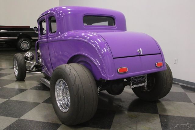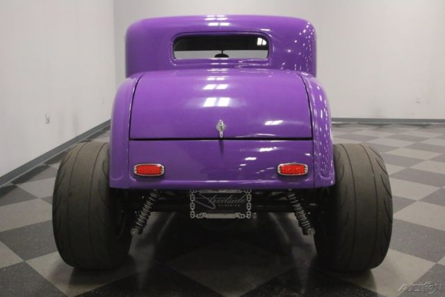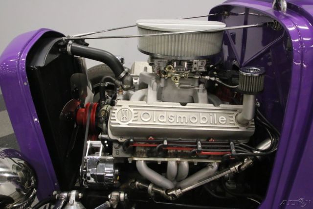 As soon as you lay eyes on this car you can tell that it is a serious street weapon. It is loud and its proud from its exposed big-block engine in the front to its barely street legal racing slicks in the back. However, most of time the fun of a car a car like this is just knowing what it's capable of as you enjoy cruise nights and club gatherings. Big engines in lightweight cars with big tires have always been the recipe for success in a street rod. For any given engine, the less weight it has to accelerate the faster is goes. So, removing unnecessary items like the fenders and the hood help tremendously and, it is the very thing that defines the street rod look. Additional weight savings were realized on this car through the use of a Gibbon Fiberglass Reproductions body which was then coated in a not so subtle shade of Purple. A tall grill of vertical bars leads the way with large chrome trimmed headlights on either side of it. The look is kept clean with the removal of door handles and the upright 5-Window cab has a significant forward tilt to it due to the serious chassis rake of the car. Chrome Smoothie wheels mount those very wide back tires and side pipes just add to the awesome look. For all the evidence of hard-core speed on the outside, when you open the door on this car you will find a nicely appointed and comfortable custom faux leather interior. The door panel is trimmed out in a Light Gray diamond pleated pattern with a Dark Gray bottom with a pull at the top. That pattern is echoed on the bench seat with the light gray pleated seating surfaces and dark gray accents. The deep dish three-spoke chrome steering wheel is mounted on a tilt column with a cowl mounted tach directly in front of the driver and a B&M shifter for the automatic transmission rising out of the floor. The dash is panel is body colored in purple with a cast aluminum Champion gauge bezel loaded with Stewart Warner gauges for the speedometer, water, oil, voltage and fuel. Overhead is a Pioneer stereo that is AM/FM/CD and iPod compatible for your listening pleasure. A full black headliner and carpeting ties the look of the interior together nicely. That big block motor perched out front for all the world to see is a very healthy Oldsmobile 455. Feeding air to all those cubic inches is a ribbed cast aluminum filter assembly. A Holley 4-barrel carb handles the fuel mixing duties and a cast aluminum intake manifold gets it to G cylinder heads which are capped by Oldsmobile aluminum valve covers. Headers get the spent gasses out to those awesome side pipes that sound oh so sweet. Power flows back through a TH400 transmission to a Ford 9" rear end with 3.00 gears. It puts the power on ground effectively through those 315/60R15 tires via a 4-link rear suspension and coil over shocks. Up front, tubular control arms and coil overs work with rack and pinion steering to provide good handling while disc brakes insure that you can haul this rod back down from speed when you decide to let the horses run. Big power, big thunder, big tires, big fun. Come on down and check out this great looking street rod.Similar vehicles