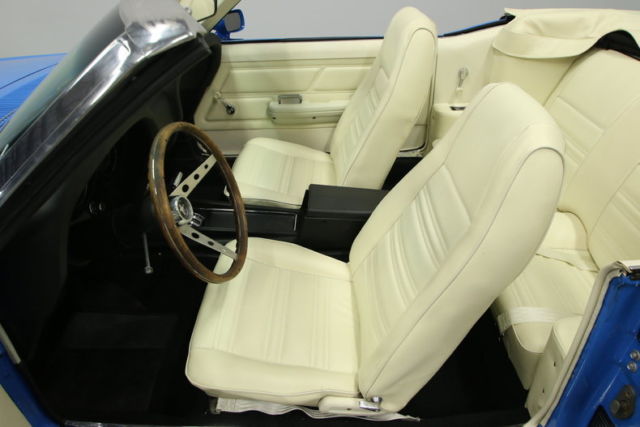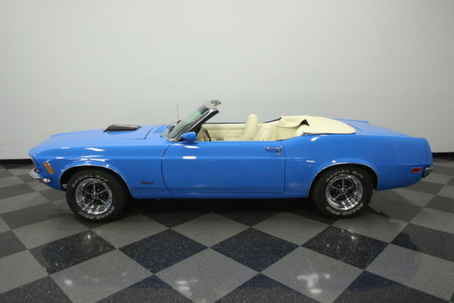 There is something ultra cool about a blue with white 1970 Ford Mustang convertible. Whether you're a fan of Charlton Heston in The Omega Man or just love beautifully restored pony cars, this is a V8 ragtop that just has an instant attraction.The 1970 Mustang is often the sought-after design. It was a one-year only style that gave the original pony car a more muscular presence on the streets. This one definitely goes for the performance-minded appearance with its bold shaker hood. That paint you can't take your eyes off of is Grabber Blue. This car had a full restoration competed in 2009, and there was plenty invested in making sure that this factory color lived up to its attention-grabbing name by adding plenty of modern clearcoat shine. Adding to this sunshine-friendly ragtop's bright attitude are front and rear bumpers that received plenty of attention so they have a mirror-like finish. But this sunny Mustang doesn't lose its aggressive side. Quad exhaust tip at the back and the Magnum 500 wheels with the Mustang logo in the centercap are nice hints that this convertible has some power behind it.Beneath the new white folding roof is a matching bright white vinyl interior, so you look good no matter if you're buttoned up or open to the world. In 1970 the Mustang seemed to strike a nice balance combining a racy feel with grand touring comfort in a way that has defied the decades. Handsome high-back bucket seats not only look cool, but they also are firm and supportive for long drives. The desirable center console with tall armrest also makes this a nice atmosphere on long trips. You get a three-spoke sports steering wheel with Mustang centercap. Beyond that is an exceptionally clear set of original gauges, and there's even added auxiliary readouts in front of the gear leaver. This all makes for an exceptionally nice setup for sunny day drives. And if the weather does turn gray, the power folding roof can shield you from the elements quickly, and the new weather stripping and window felts add to your security.When you pop the hood, not only do you get a great view of the aforementioned shaker, but also you see there were Cobra valve covers added for even more aggression. But really this is more than just intimidating in appearance. You're looking at Ford's legendary 351 cubic-inch Windsor V8. This bulletproof motor has a great blue engine block, and there is a huge list of upgrades for it. That's why we're not surprised to see go-fast goodies such as a four-barrel carburetor, performance intake, and long tube headers. That last upgrade also contributes to the wicked rumble from the dual exhaust. All this power gets to the ground reliably thanks to Ford's stout C4 three-speed automatic transmission that feeds the versatile 3.50 Traction Lok rear end. Handling is also done right in this Mustang with front disc brakes and Sigma Grand Prix tires.Aggressive, fun, and iconic 1970 was one of the most distinctly styled years for the first-generation Mustang. Complete with Marti Report and owner's manual, this is a classic convertible that you will be proud to drive, and it has the right features so you can do it every day. Call now!!!