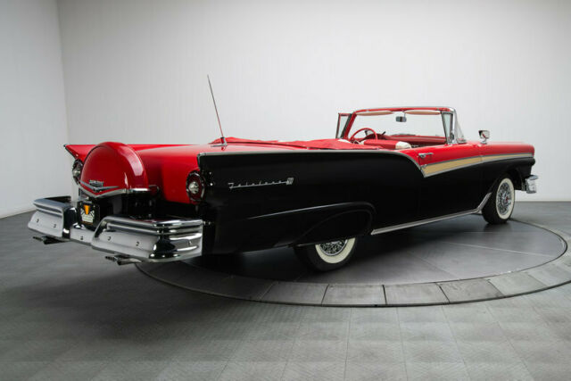 If you're the kind of enthusiast who likes to envision having their name engraved on trophies, take a minute to get to know this killer Ford convertible! Driven mere break-in miles since restoration, and presenting much better than when it originally rolled down Ford's storied assembly lines, this impressive drop-top has been transformed into a take-no-prisoners weekender that can consistently headline cruise nights. You won't be staying under the radar with its professionally finished Flame Red on Raven Black paintwork,... which has been correctly applied over a very clean body. There are no obvious signs of wholesale panel replacement, suggesting the car has been a straight, rust-free shell its entire life. Thanks to Jerry's Classic Cars in Springdale, Arkansas, that shell's fit and finish is almost good enough to turn reflections into reality. And ultimately, everything adds up to one super cool cruiser that, thanks to its spectacular combination of color and trim, has an absolutely magnetic presence! Tilt the car's sculpted hood and you'll find a correct, 312 cubic inch Thunderbird V8 that's fully rebuilt and dressed to impress. Behind that beefy Y-block, a stalwart Ford-O-Matic 2-speed sends power to a familiar Ford 9-inch that's fitted with pleasant, highway-friendly gears. The car's suspension remains close to its original configuration, with factory power steering complementing factory control arms and traditional leaf springs. Braking is quick and adequate thanks to power-assisted drums, which occupy all four corners of that chassis. And on the outside of those drums, Coker Classic whitewalls spin around classy wire wheels. This first class drop-top is a nicely polished piece of jet-age magic that's ready to be shown and celebrated. If you're looking for a first-rate classic to add to your collection, call, click or visit to claim this incredible Sunliner!