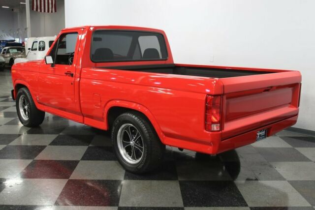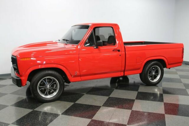 This 1981 Ford F-100 is going to help you re-define muscle truck. After all, it doesn't just have a cool/coordinated color combo and five-speed stick, but also the V8 is an upgraded Mustang performance heart. And you get this whole package for one obtainable price.You can instantly tell this truck is the aggressor. The red paint was an upgrade later in life so it has a nice shine and a vibrant look. And the added cowl hood really ups the intimidation factor. Plus, the front end has been blacked-out with the grill, bumper, and upgraded dark background headlights. This feeling continues down the side with tinted windows as well as the mirrors, trim, and door handles in black. The black liner paint in the bed coordinates with the package while also continuing this Ford's life as a useful pickup. Even the upgrade 15-inch Ridler modern alloys carry this intimidating dark attitude. You'll also love the detail work, like the flush roll pan and Cobra badges on the side. So you can really see this is a thoughtful total build.