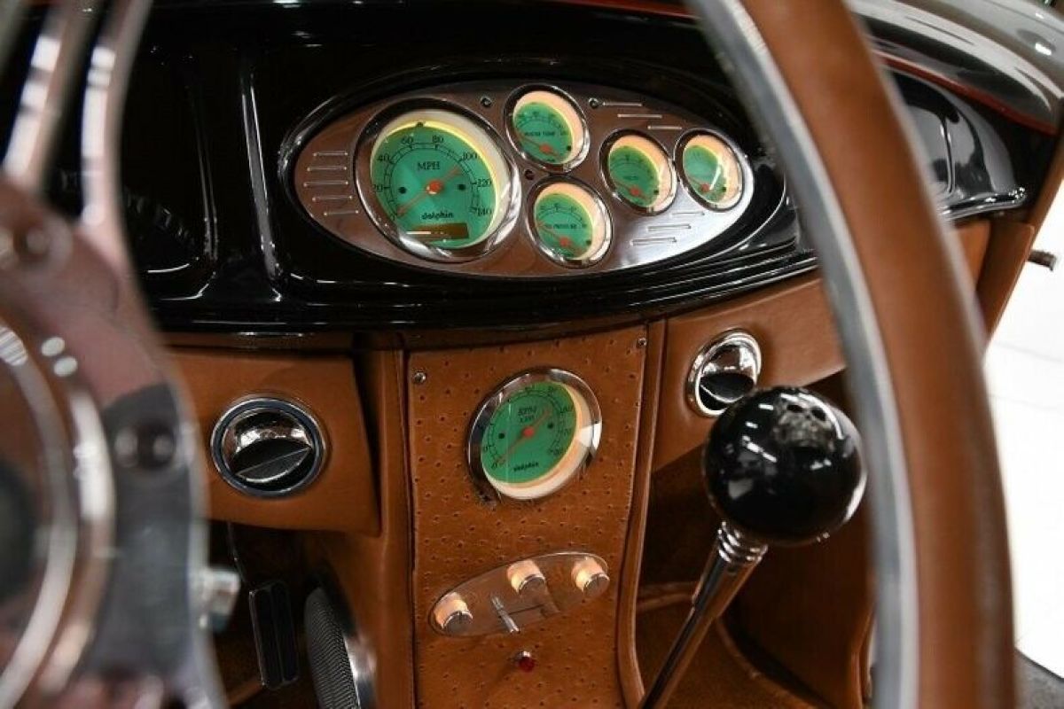 This is one sharp looking, quality built coupe with some muscle!EXTERIOR: Classic Hot Rod- 3 window chopped coupe with suicide doors and aggressive stance. High quality fiberglass body, the panels fit superbly, everything is straight. I think the colors are rich and nicely broken up with a red pinstripe. The paint is polished out very smooth and glossy, show quality finish. There are going to be a few minor flaws if you look for them. I like up front and it has the big original style headlights with the glass lenses, braided stainless cables go to them. The front turn signals are built into the stainless spreader bar. In back it has the original style tail lights with LED bulbs. All new lightly tinted glass. The paint scheme continues right through the door jambs and even across the dash. Beautiful polished Billet Specialty staggered wheels. 17s in back and 15s in front, much fatter tires in back. Doors open by remote.