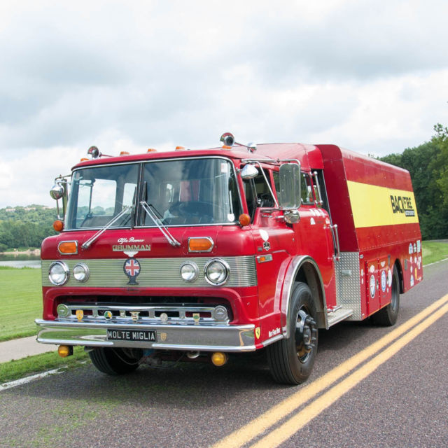 Rebuilt Ford/Caterpillar 3208 634 CID V-8 turbocharged diesel engine (250 hp) Automatic transmission Hodges Custom Hauler body Car hauler will hold any width car with a max height of 60″ All-aluminum car deck w/in-floor lighting Fully enclosed rear aluminum deck w/canvas openings 12,000-lb. remote-controlled winch Four under-deck storage lockers Two-piece aluminum loading ramps Power four drum air brakes and electric trailer brakes and power steering Air-conditioning Red exterior and black interior JVC AM/FM stereo with CD player and Citizens Band radio Town and air hornsNeed something to haul your track car to races or your garage queen to shows and exhibitions? MotoeXotica presents a truly unique vehicle in this 1986 Ford C8000 Fire Truck hauler. Designed in the style of mid-1960s race car haulers used by many racing teams of the period, this Ford-chassis, Grumman-bodied and Caterpillar-powered diesel is now a car hauler that used to be a fire truck.