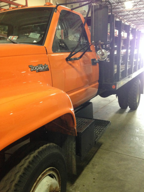 Up for sale is our 1990 GMC Topkick work truck. This vehicle is in excellent shape for its age. It runs and drives as it should. Only 62,650 miles on the odometer, ith no rust on the cab. This truck has a NEW Jasper engine with less than 700 miles on it! An Allison automatic transmission makes this truck easy for anyone to drive. The interior portion of the cab shows wear from use, ut overall is in great shape. All glass is good with no cracks present. The vinyl seat cover is damaged on the drivers side, nd was repaired with tape. There is currently a removable seat cover covering over the original vinyl seat. The exterior of the cab is in excellent shape, ith no major damage. There is some fading of the orange paint on certain areas, ut the paint is still intact on all panels. Minor dents and scratches, hich are to be expected with a truck of this age. Truck has a single fuel tank located on the passenger side. The bed of the truck is 16' long, ith a wood floor. The wood shows sign of use, ith some tar spots. But all boards are present, nd none are warped. The stake sides of the bed are in excellent shape. All are present, nd they are mostly rust free. The tires on the truck are in excellent shape, ith plenty of tread life left. The truck currently has a DOT inspection sticker which is valid through the end of March 2016. This truck comes with a clear title, nd would make a great addition to your fleet.