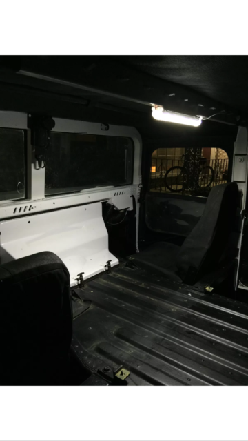 Interior-A. New LED 12/24v interior dome light, works GREAT! strong and powerful, lights whole interior fully.B. Front highback seats near NEW, desirable high back seats, all black in color, rear seats in great condition.C. Interior floors and console area all primed and painted with rustoleum industrial paint and primer.D. Dash, front console, windshield area all painted with automotive Acrylic Urethane BASF primer and paint. E. Any plastic pieces i.e. headlight switch, gauge cluster area etc. painted with matching plastic paint.F. Modern and more desirable Humvee A2 compact steering wheel