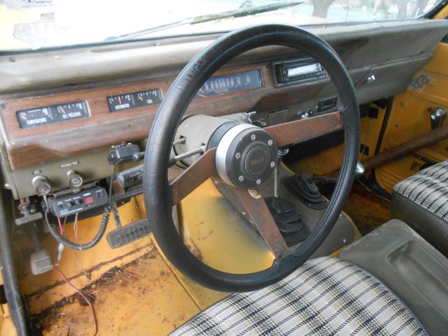 The Scouts floor is very solid and the under carriage shows minor scaling here and there. Inside floor has some minor rust but nothing a sanding wheel can't sand off. The door edges are evengood on undersides. Tailgate is virtually rust free but has some damage around button because some Texas kids tried to break in one time not realizing it latches on the sides. Damage should be fixable. It does latch. It is cosmetic. There are a couple of small dents. They areon thefront of passengers fender, rivers door pillar, nd a small spot on hood corner as shown in pictures. The Scout still wears its original yellow paint which is wearing thin at spots. The rally stripes on the side of Scoutare very cracked from the sun drying themout. Seats should be reupholstered and interior restored. The rear quarter panels are decent except for around the wheel lips on the front side of quarters and on the passengers side just behind the door on the lower quarter. The metal is pin holed and while through at spots, he metal in the affected area is still solid. Glass is good. The hardtop roof has some minor scaling from sweating on the inside but outside is good with some minor surface ruston the roofs edge where it attaches to body of the Scout, t the hinge of the rear window, t needs around a four inch piece of metal welded in to make the hinge operate correctly. Tires aredry rottedbut hold air as does spare. While the motor was rebuilt in 1998 along with the transmission, have not tried to start it. The last owner put a Edelbrock 4 bbl. Carb on a 4 bbl. intake without a air cleaner and told me he drove it around his yard but it didn.t run as it should after swapping the carb and intake. He included the original 2 bbl. carb and intake and air cleaner and it will come with it as well as the other parts in pictures. This scout has a bumper brush guard, uggage rack, nd hitch (not attached)but included in purchase. There is a six point roll bar but the front pieces were not installed and the fronts while rusty from storage, hould clean up if sand blasted. This was for cosmetic purpose and not really safety. It could easily be removed as its just screwed to the floor. Car came with air conditioning and does not work currently as its not hooked up. 4x4 driveshaft is in rear floor area of scout as it is not hooked up since transmission got done. The title is clear. This is a very good project vehicle. It is being sold as is with no warranty of any kind. Bidder is to pay $500. non refundable deposit at auction end within 24 hours through Paypal. Feel free to come look at vehicle prior to bidding by scheduling a time with me. Cash is expected in full upon transfer of title. I do not take checks.Buyer makes all shipping arrangements. Buyer is responsible for all tax, ags, ransfer fees, nd shipping cost. Ask all questions before bidding. I represented this vehicle as accurate as possible.All sales are final. Happy bidding.