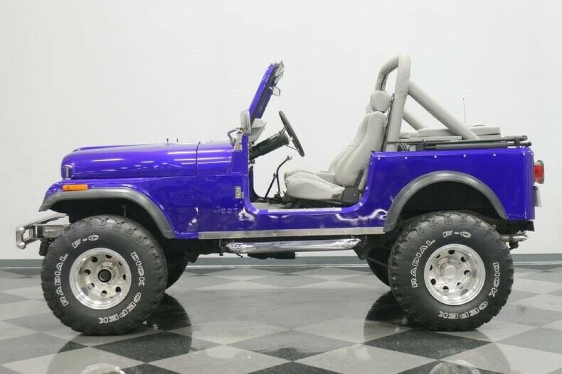 When we call a Jeep a go-anywhere machine, it doesn't just mean we like these 4x4s for the off road. That's why this 1983 Jeep CJ7 has such vibrant paint, a comfy interior, and upgraded V8 power. It's great for showing off in-town, too.The Plum Crazy purple gives an attention-grabbing first impression. And there are some people who will give you a cool nod for having a classic Mopar color since Jeep went under Chrysler ownership later in life. The shine is particularly impressive, and so we imagine this may even glow in the dark a little! This big shine is also likely why they upgraded the shine on polished components, like the tubular front bumper, side steps, rockers, and side mirrors. Even the big 15-inch wheels add to this luster. There's a new black Bestop soft top and doors, and even those are part of a well-coordinated look with the fender flares.