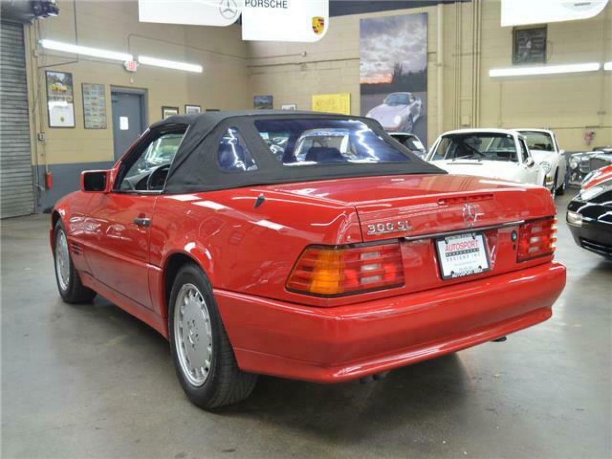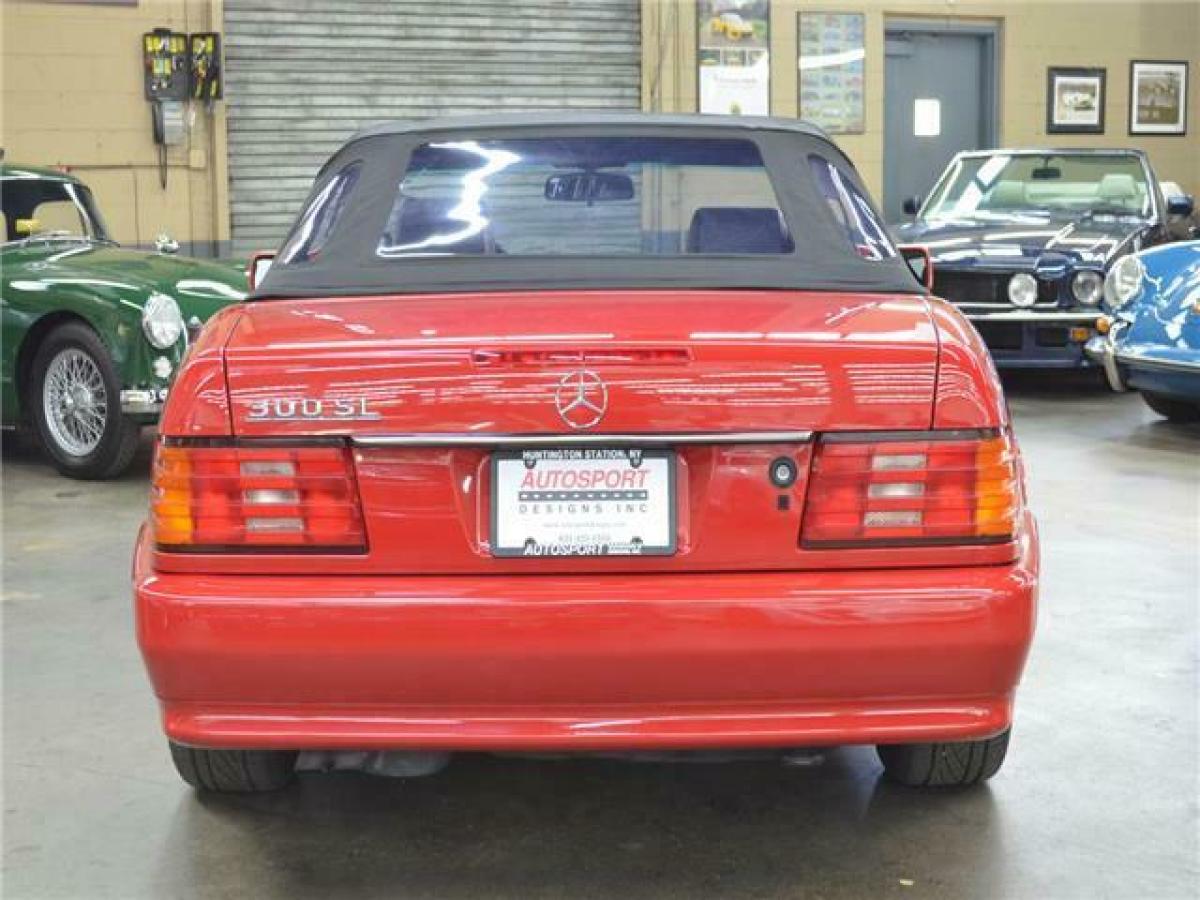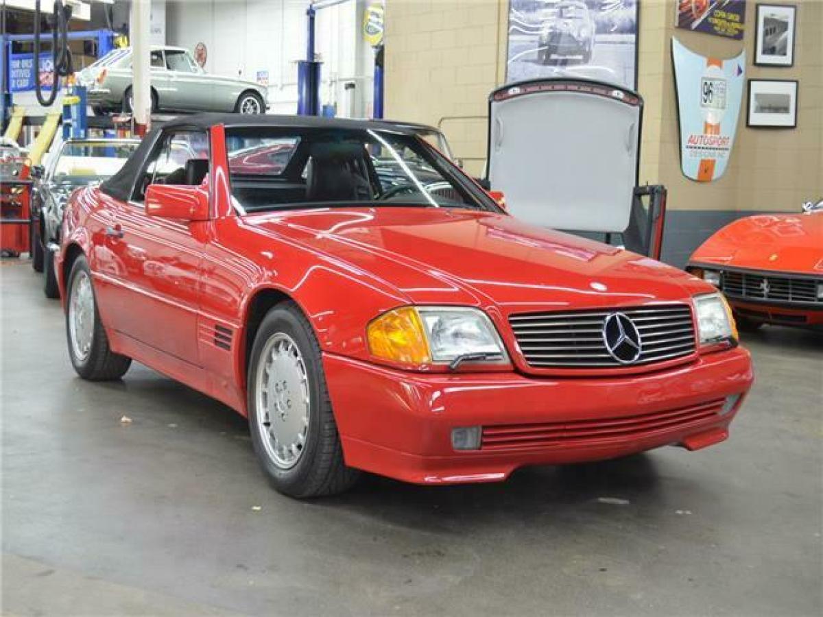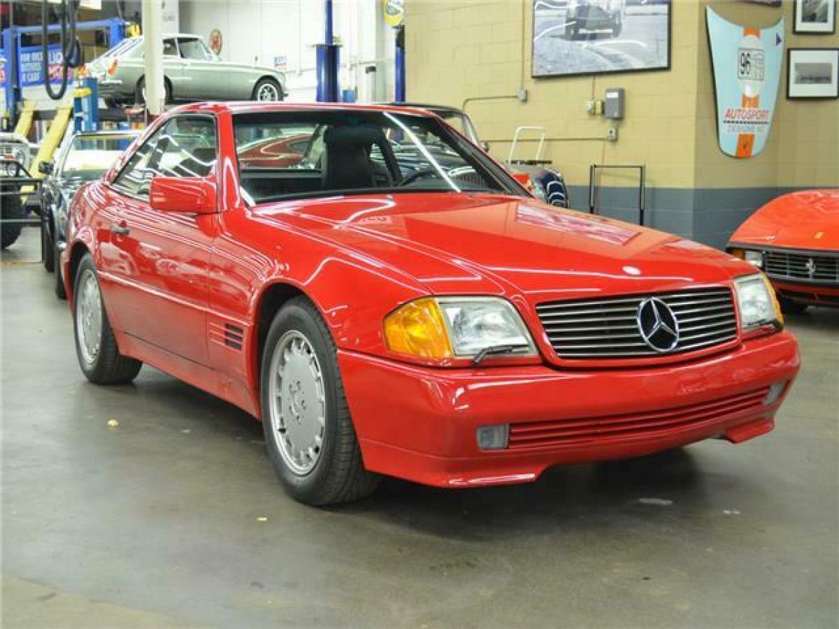 1991 MERCEDES BENZ 300 SL ROADSTER 5-SPEED: --Signal Red with Black leather interior, Black carpeting, Black soft top, Factory Signal Red hardtop, 3.0 Liter inline 6 Cylinder, Rare 5-speed manual transmission (less than 400 US spec cars had this option), 49,000 miles. After almost 20 years of production for the previous generation SL-class, Mercedes launched this new R129 generation for 1989 with substantial improvements in both technology and safety over the outgoing model. The new SL had a first-of-its-kind roll bar in case of a roll-over, ABS and dual front airbags were standard, traction control and an electronic limited slip differential were standard for the 1991 model year. Other new technology advancements included power side mirrors, power rearview mirror and full power seats which allowed this SL to be the first passenger vehicle to have seat belts integrated into the seats. Lastly, this new SL had a full power retractable convertible top. Standard equipment included a color matched Aluminum hard top. The 300 SL is powered by a well-balanced 3.0 liter DOHC inline 6-cylinder engine producing 217bhp. It has always been well serviced and cared for regardless of use as shown in the exceptional condition it shows today. Recent servicing includes fluids, new tires, valve cover gasket, spark plugs, new soft top and rebuilds of the convertible top hydraulics and factory Becker radio. Signal Red was the only option choice for these early R129s in which the lower body panel moldings were color matched. All other colors had contrasting moldings. This rare 5-speed SL is in excellent condition throughout. It is complete with all books, tools, keys, first aid kit, original window sticker, factory hard top, jack, original spare and service records.Similar vehicles