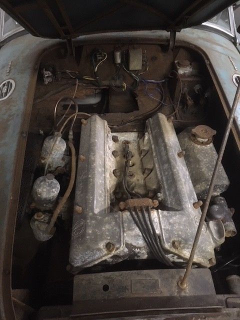 Your are bidding on a 1959 MGA twin cam roadster. This car has been in storage since the early '70s. It has never had any attempt at a restoration and retains its original, numbers-matching engine with engine number plate still attached to engine. It even still has the original distributor that it came with from the factory, DM2 40518A, which is almost unheard of as the factory offered free replacement distributors to correct an oil-burning problem these cars had when new. It also has its original glacier blue paint and light grey interior. The onlyrust holes I could find on the carare where mice built nests in 3 areas, including the trunk floor, front pan behind the radiator shell, and the shelf where the heater sits near the firewall. The rockers, frame, fenders, fender wells, etc, are all in good condition, as can be seen in some of the pictures. The only parts I noticed missing from the car are the headlight buckets and the front turn signals. Everything else is accounted for, including the spare wheel and everything that is unique to the twin cams. The engine does not turn over, but I have not tried putting anything down the cylinders to loosen it up, as I would expect that whoever buys the car will do a complete engine rebuild anyway. I do know that the car had no engine issues when it was parked in the '70s. It had just become an old car back then that no one apparently wanted to drive anymore.I expect payment within 5 days of the end of the auction. The car can be picked up after your check has cleared my bank. Shipping is the responsibility of the buyer. Buyer will be given a Georgia Bill of Sale only for this car as Georgia is a non-Title state for cars older than 1985. There is NO TITLE for this car. (EBay does not have an option box for “Bill of Sale Only”, so disregard the “Clear Title” option in their heading.)