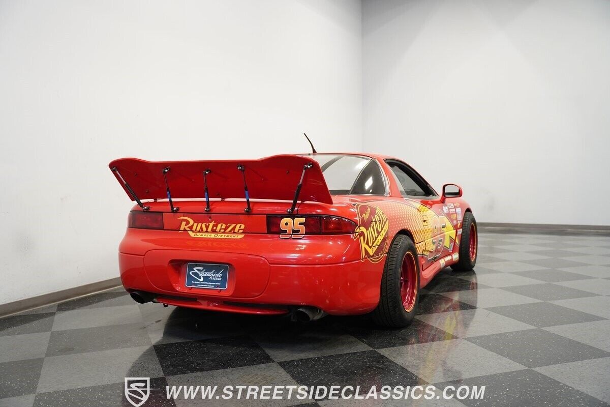 Hey there, champ! Strap in and get ready to leave everyone in the dust with this Lightning McQueen-inspired 1994 Mitsubishi 3000GT. Coated in a red that's as fiery as the final lap at Radiator Springs, this speed machine is decked out with high-octane decals and graphics that shout speed and spirit. Equipped with 15-inch dirt track style wheels and tires sized just right for tearing up the asphalt-215/60R15 up front and 215/65R15 in the back-every road becomes a racetrack. Plus, with a sleek fiberglass bumper and a roof-to-rear deck spoiler, every entrance is a grand victory lap.