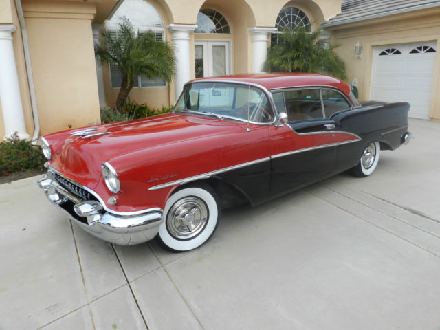 1955 Oldsmobile 98, All original car with exception of being repainted in 2000. All original leather interior from 1955. Car is in amazing condition inside and out. Factory correct 324 cubic inch Rocket V8, Correct Hydramatic 4-speed automatic transmission. Black and Red original color exterior with untouched matching factory original leather interior. Factory power steering, Factory power drum brakes, 15-inch steel wheels. This sweet '55 Holiday Coupe manages to wrap all of the charms in one classy package. Car has been very well taken care of and always garaged. Car has been owned by the same family since new and passed down from father to son. 83,000 original miles on the car and it runs great. The car possesses everything great about '50s American luxury. With all the power conveniences not found in most cars of this era. Body and paint are in exceptionally nice condition with no sign of any rust. Floors, trunk, underside of car super clean with NO RUST. Chrome and stainless are exceptional! Everything works as it should on this car including dash lights, horn gauges, windows, seat and so on. New radial tires. This Olds runs and drives very well with no issues. Original front hood emblem is currently not on the car but is included should new owner decide to screw it back on. The emblem is in excellent condition (see photo) All original jack and a spare is included. please call me at 951-776-9603 with any questions or offers on the car. I will return all calls and emails promptly.Similar vehicles