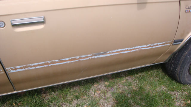 The body is virtually complete and original mostly with only surface rust. The exception to that is the trunk lid which has rust coming through from behind along the rear at bottom. Also the front left fender has a small pin sized hole from previous damage which seems to have rusted through. The moldings and emblems are virtually complete. The ones that have fallen off are in the glove box or in the trunk. There are only two pieces of molding missing: the right front door 'belt molding' and the left front fender 'belt molding' which is a small piece which extends the door molding to the wheel well (you can see it on the right side of the car).