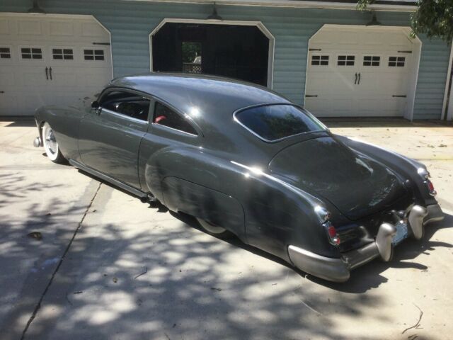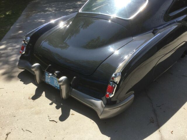 Body has been sectioned 3.5 inches, top has been chopped 3.5 inche, B pillars have been slanted forward, Rear quarter windows have been taper cu, fender skirts have been widened over 3 inches and flush mounted, rear deck lid has been hand formed and sunken, front windshield has been widened at the center and uses ‘49 Oldsmobile glass, front wheel openings have been radiused, exhaust has been hand built and sunken into the rocker panels, visor has been hand built and flows into the roof beautifull, Hood has been peaked, door handles shaved, trunk shaved, all interior moldings cut and fitted, Cadillac front clip is so perfectly done it looks like it was factory installed Every weld on the car is TI, ground and metal finished.