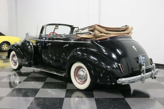 You're likely looking at this 1941 Packard 120 convertible because you already know what it is. And if that's the case, you also know that it's a bargain. Arguably the best-driving Packard of the early 1940s, the 120 was hardly a "bargain" Packard, because it's got all the big car charm and looks, and for the moment, it's one of the most affordable ways to get an eight-cylinder Packard convertible of any kind. Wearing proper Packard Black... paint, this handsome coupe gets just about everything right. Paint and bodywork are very presentable, which, again, makes the price seem almost comically low. It's not a "fixer-upper" it's ready to enjoy and while it's not perfect, it's awfully danged nice when cruising down the road. The tall, narrow Packard grille is a trademark, as are the flanking fender grilles and body side moldings, all highlighted by the car-length trim work to make it look sporty. Sidemounts are a rather rare option on the 120 and give it a presence that rivals its more expensive siblings. In fact, the biggest problem with the 120 back when it was new is that it was simply too good and buyers figured why should they step up to a large-series car when this one was already excellent in every way? It shows in the detailing around the running boards, the hood vents, and the "donut pusher" hood ornament, which was very similar to the larger cars. The chrome details are just as impressive, with newer shiny bumpers and nice stainless details, and the tan canvas convertible top is in good shape as well. If you want a Packard to drive first and foremost, a 120 is what you should be seeking. The black leather interior is a great matching complement to the black bodywork and uses period-correct vertical pleats on the wide bench seat. It seems roomy inside because Packard moved the shifter to the steering column a few years earlier, and because this is a yacht-like 4-door, there's plenty of room for passengers in the matching rear bench. The steering wheel is nicely wrapped and perhaps showing some age, but the rest of the beautifully painted dash and instruments are quite nice. This car includes optional dealer-installed heater and an underdash AM radio, which was cutting edge tech at the time but sadly not functional today, which is hardly surprising. Rumble seats were discontinued in 1938 which means there's a huge trunk, which carries a jack set and carpeted mat. There's also the aforementioned fitted tan canvas top to give it a beautiful look, top up or down. The 120 uses a 282 cubic inch straight-8, which makes, naturally, 120 horsepower. It's as smooth and torquey as you'd expect and moves the trim convertible with genuine enthusiasm. It was painted with proper Packard olive green paint some time ago (possibly not since the factory) and we don't see many deviations from the original spec under the hood other than maybe the radiator cap and chrome oil bath top cover. An oil bath air cleaner is correct equipment though, as are the coolant hoses, and a single downdraft carburetor that offers great throttle response. The three-speed manual transmission shifts easily thanks to synchromesh on 2nd and 3rd gears and it's pretty happy at 55 MPH. The 120's innovative Safe-T-Flex independent front suspension was now standard across the line, but it was still a great handling car with a lot of confidence on the road. The brakes were similarly powerful and reliable for the period. Handsome steel wheels with more red pinstripes, trim rings, and Packard hubcaps are wrapped in 7.00-15 whitewall tires for the perfect period look. If you know Packards, you know this is a special car. It's ready to drive right now, and if you haven't experienced the joy of a 120, this is probably your last chance to get a drop-top at anything approaching a reasonable price. Call now!