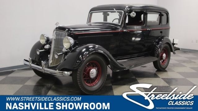Plymouth realized in the early '30s that people wanted a full sized, full featured car. In 1934, they produced this car, the PFXX model which indicated that it was a "Special Six" version. It incorporated several new advances in design along with classic early 30s styling. Those advances plus a nicely refreshed interior makes this a wonderful car from this era to drive around and enjoy. Check it out. The overall shape of the car is familiar...1930s, but the details set this car apart from the crowd. At the front of the piano hinged hood is a sailing ship hood ornament that appears for the first time. That was made possible when the radiator cap was moved to the underside of the hood. The chrome on this car is all newer and shines brightly with a tall grill of vertical bars with a winged Plymouth badge in the center. It is flanked by big chrome headlights and dual air horns on each side with a simple shiny bumper underlining it. The body of the car is Black, and received a midlife repaint, which means back in the 60s sometime, and while it is showing its age a bit, can be thought of as having a "period correct patina" to it. A red pinstripe runs down the length of the car which compliments the maroon wire wheels, and of course separate fenders and running boards are a 1930s required feature. Open the door and you will find a wonderfully refreshed interior that makes cruising in this car comfortable and enjoyable. The door panels echo the shape of the Plymouth wings on the grill in a lighter fabric center and darker maroon vinyl surround with the window frames trimmed out in wood. The seats are absolutely gorgeous, comfortably upholstered in button tufted maroon vinyl both front and rear. A big three spoke steering wheel sits in front of one of the advances made in this car with the gauges moved from the center of the dash to directly in front of the driver for the first time. And that gauge cluster is a work of art with its series of ovals starting with the overall cluster and working inward ultimately delineating the individual gauges. The passenger gets an oval glovebox with a beautiful sailing ship icon in the center and the shifter for the manual transmission rises from the floor in the center. Open the hood and you will find that wonderfully stock and very likely original, numbers matching, "Special Six". It is a flat head engine, so is a very simple design, but has signs of good regular maintenance with new plug wires, fuel lines and coolant hoses as well as a new muffler in the exhaust. Also, this engine incorporates a full pressured and filtered oil system and rubber "Floating Power" motor mounts, as well as developing about 10% more horsepower than its 1933 predecessor. That power flows back through a 3-speed manual transmission to a solid rear axle on leaf springs. The front suspension was somewhat ground breaking for 1934 in that it incorporated an independent suspension with unequal length A-arms and coil springs. The other feature incorporated for the first time was hydraulic brakes both front and rear. 7.00 X 17 tires are mounted on the maroon wire wheels in classic 1930s style. A full sized, full featured, advanced design Plymouth from 1934 with a comfortably refreshed interior. Come on down and check it out.