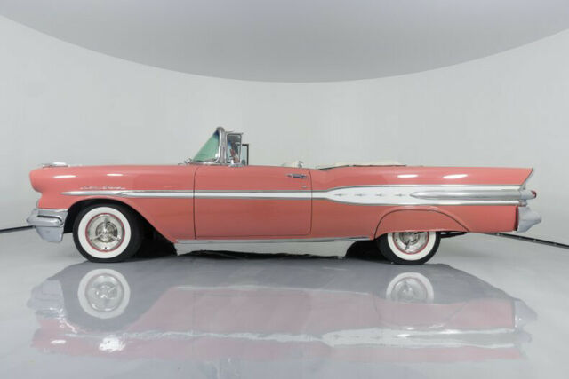 This 1957 Pontiac Star Chief Convertible for sale has a 347c.i. (Date Code Correct) V8 w/ 4bbl Carb, Hydramatic Transmission, 3.23:1 Rear End Ratio, Correct Caribbean Coral Exterior, White Vinyl Interior, New White Power Convertible Top, Power Steering, Power Brakes, AM Radio, Restored Steering Wheel, Dual Mirrors, Upgraded Bucket Seats, Front and Rear Seat Belts, Convertible Top Boot, 14" Steel Wheels w/ Pontiac Hubcaps, Wide Whitewall Radial Tires, Very Nice, Rarely Seen, '57 Convertible Pontiac!Similar vehicles