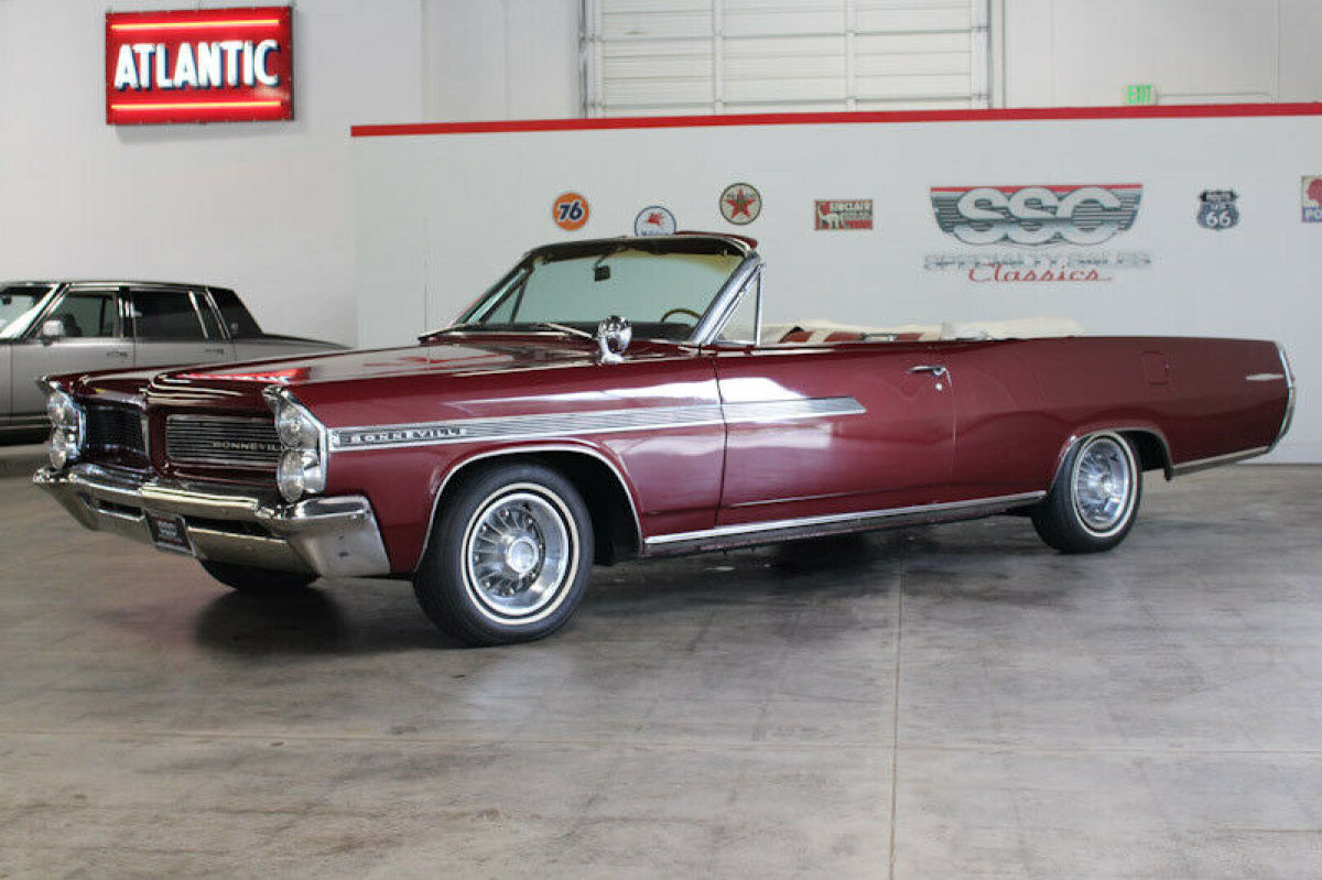 This 1963 Pontiac Bonneville 2 Door Convertible (Stock #F13309) is available in our Fairfield, CA showroom and any inquiries may be directed to us at 707-419-8200 or by email at [](mailto:).Absolutely Beautiful 1963 Pontiac Bonneville ConvertibleThe next amazing classic up for grabs in our Fairfield showroom is this gorgeous 1963 Pontiac Bonneville 2 Door Convertible with Marimba Red (burgundy) exterior paint and a maroon vinyl interior. You’ll find a 389 cid V-8 engine under the hood with a white power top, power steering, power brakes, 8-lug wheels, a period correct radio and a GM Hydramatic 3-speed automatic transmission. This sensational classic is in nice condition throughout and performs on the open road like a dream- you won’t find a more prestigious example anywhere at the current asking price.Highly Factory Optioned w/ Eye-Catching ExteriorThe current owner informs us that this 1963 Pontiac Bonneville Roadster was originally sold in Ohio and has been enjoyed by five different owners over the past 55 years. There is not extensive documentation on this beautiful classic so we are unsure when it was repainted, it appears to be an older frame on restoration completed at a good level. While there are a few minor blemishes to be discovered, the body is exceptional with beautiful chrome work and fantastic exterior paint; it is an excellent period correct example with extensive upside for one lucky collector.The interior is just as impressive and the two-tone seating with a white accent stripe and the Pontiac logo are perfect for this classic vehicle. Tasteful elegance is the phrase that comes to mind and with the beautiful white soft top, this classic is truly picture perfect. You’ll find a highly correct dash with all the right instrumentation as well, including a period correct radio and a beautiful steering wheel. Most would consider this one a very mid-level driver that would be perfect for local shows.Additionally, this 1963 Pontiac Bonneville Convertible handles the open road like a champion with smooth, responsive handling and plenty of power. You can cruise down the highway at 65 MPH in comfort while turning heads the entire drive. It also has good braking power so it’s truly a complete package that’s ready to be enjoyed.Ready to Show, Drive & Enjoy Right AwayOverall, this 1963 Pontiac Bonneville 2 Door Convertible is a beautiful, nicely maintained classic that needs nothing to be enjoyed immediately. This one has to be seen in person to truly appreciate because the high end restoration still really impresses- it is an outstanding value at the current asking price. For more information about this vehicle, visit our Fairfield, California showroom, give us a call at 707-419-8200, or email us at [](mailto:). Be sure to mention Stock # F13309 as well.Legal Disclosures: Specialty Sales Classics has advertised and sold thousands of classic cars since our founding in 1978. We strongly encourage any and all buyers who are unable to view the vehicle in-person to perform a Pre-Purchase Inspection (by an independent party of their choosing) prior to the purchase. Given the age of many of our vehicles, it is extremely difficult to adequately describe all aspects of each vehicles condition in the limited space available and we have learned that these Pre-Purchase Inspections are helpful to all parties involved.The information presented for this vehicle is deemed reliable, but is not guaranteed as a basis of purchase. The Buyer should make a thorough, independent inspection and investigation of the vehicle prior to purchase.Similar vehicles