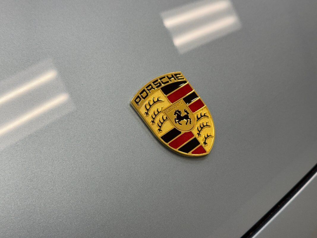 This roadster is a standout in Silver Blue Metallic on its fiberglass body, incredibly low to the ground and perched on 15-inch wheels. Arching rear hips lead to single LED tail lights sculpted into the single piece rear clip, held in place by leather straps and open to the atmosphere via twin grilles over the rear mounted engine. A single tailpipe emerges just under the license plate. The front fenders also rise like rounded mounds that terminate at the headlights which cant rearward providing some aerodynamics, flanking a sloping nose emblazoned with the Porsche crest in line with the gas cap protruding from a hole in the hood. The Spyder emblems present in gold and a chrome side mirror is mounted nearby on the driver's side, while Wendler tags are mounted on the bottom of the front quarter panel. Proportionally, the door and windscreen are small but fitting for the car. The only imperfections are some scuffs under the rolled body panel behind a wheel.