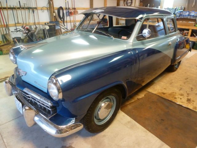 : 2 tone light blue/ dark blue, 170 cubic inch flat-head 6 cylinder, 3 speed on the tree with overdrive and Hill Holder, Sunvisor, Side Skirts, 17 gallon gas tank and gets 20+ mpg.