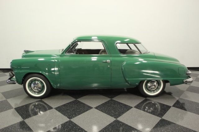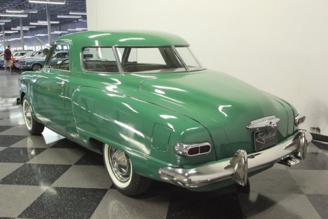 This 1949 Studebaker Champion Starlight Coupe is the perfect attention-grabbing classic. It combines rarity with nice features and a solid investment in a quality. So we are amazed it's offered for such an affordable price. We love the look of these Starlight coupes. The unique presentation with the long trunk and wrapping around rear glass made these look absolutely futuristic in the '40s. And more than just distinctive, it's quite rare. Studebaker produced less than 10,000 of these... Champion coupes in premium Regal Deluxe trim in 1949, and we doubt you're going to find a finer surviving example. This one received a nice restoration later in life, so the wraparound chrome bumpers, distinct grille, artful taillight bezels, and all the other brightwork shines like a regal classic should. Even the correct two-piece wheel covers are still in place! And the green paint offers the right period-correct presence and the perfect backdrop for all this shine. Inside is the ideal presentation for both show and comfort. For example, the seats are finished in a cozy plaid cloth. And the brown piping here nicely coordinates with the door panel trim for a very uniform presentation. You get the stylized Studebaker steering wheel with the thin and grippy grooves that instantly remind you of classic motoring. Beyond that are cool features like the column-mounted shifter and dash-mounted rear view mirror. This is truly vintage motoring at its best. Even the heater is still working so you won't have to freeze on those mornings when you want to be the first one at the car show. Plus, there are provisions for modern R134a air conditioning cleanly installed if you don't want to break a sweat on the way home! Studebaker's sturdy 170 cubic-inch straight-six looks nice in this engine bay with the smooth green paint funneling your attention to all the period-correct components. More than just look good, you can tell by upgrades like the aluminum radiator that this classic was still meant to drive. And when you look at the undercarriage photos, you not only see an exceptionally clean car, but also you might notice that it has been set up with a true dual exhaust. So you'll love letting it run into higher RPMs with the column-shifted three-speed manual transmission. Rarity, distinction, and all-around retro-cool coupes like this are usually not this affordable. So don't let someone else take home this Champion. Call today!!!