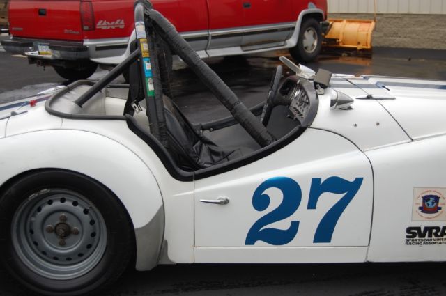 1959 TR3 race car. The car was set up to race almost from new. The Previous owner set the car up in the early 1960s and raced it until the mid 1990s. Has a full race adjustable suspension (front and rear) with a lowered stance. Has new Verdsteen radial tires 185 X 70 X 15 and another set of 5 Race wheels and tires. The engine in the car now was rebuilt 4 years ago and have $7500 in recent receipts for the engine, tires, and general service. The car has an over drive transmission with posi-traction rear end. Has a header and large exhaust with dual stromberg 175 CD carburetors (rebuilt). There is a Race engine that comes with the car as well with skimmed head, 3/4 Grind cam, larger pistons, Mallory dual point distributor, misc parts, etc. The car starts on the first push of the ignition button. Has a full roll cage attached to the body, fuel cell, fire extinguisher, etc. I have the original Vin plate too. The undercarriage is in very nice shape and does not have any frame damage or rot. All gauges are Stewart Warner and work perfectly. A vey nice patina on the car, considering its age. Comes with a full race suit and gloves too! Below is a link to a video taken outdoors on November 17 outside at 33 degrees.Also, the car can be registered to drive on the street as well.
