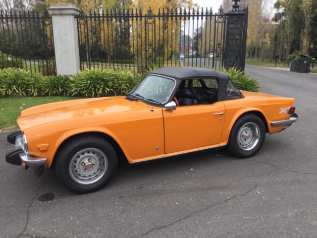 This is a NO RESERVE AUCTION! 1975 Triumph TR6 Roadster. Very rare and very 70s Topaz Orange, with Black interior and Black top. Very solid rust free throughout with original floors, rocker panels etc. Thebody is very straight with the exception of a dent below the grill, ( see pics ). Nice dash, interior and top. We have lots of service records dating back through the last 2 owners . The car has always been garage, not driven much this last year so would benefit from a tune up carburetor adjustment etc. Currently regd with clean title. You are welcome to come and view/inspect/test drive the car anytime during the auction at our premises here in Burlingame Ca. We are just 10 minutes South of San Francisco International Airport . Happy to answer any questions through the Ebay Email Forum, or we can be reached directly by phone at 650-344-6393. We are happy to arrange/assist Shipping Worldwide, or, Trucking throughout the US. As with any used car of this vintage, this one is Sold As Is, with No Warranty Offered Or Implied . Winning Bidder must contact us within 24 hours of the auction ending . Pleas, only bid if you intend to purchase, we report all None Paying Bidders to Ebay. Pleas, if you have any negative feedback or less than 10 positive feedback, contact us before you bid or your bid may be cancelled. Thanks for looking.Similar vehicles